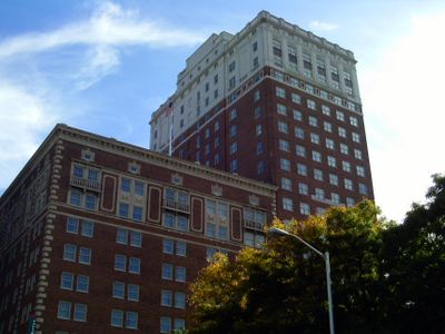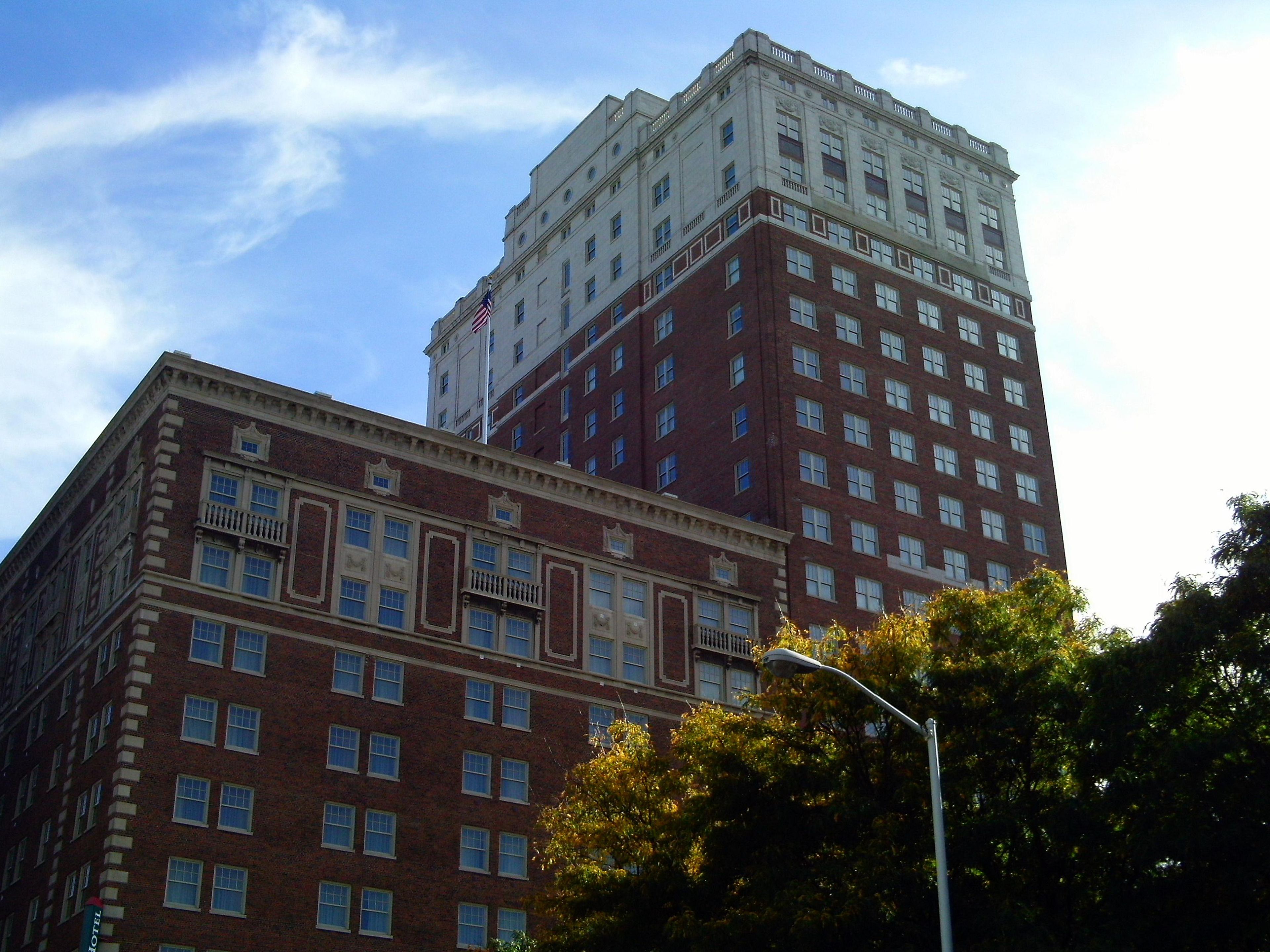 Le Fort Shelby Hotel s'élève sur 27 étages avec une architecture de renaissance classique, présentant des intérieurs en marbre et des ornements en plâtre.