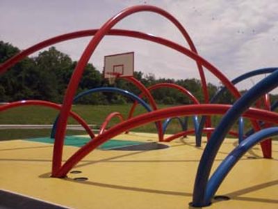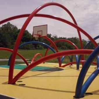 L'installation présente vingt-quatre arches en acier rouges et bleues disposées en forme de terrain de basketball avec des paniers réglementaires aux extrémités.