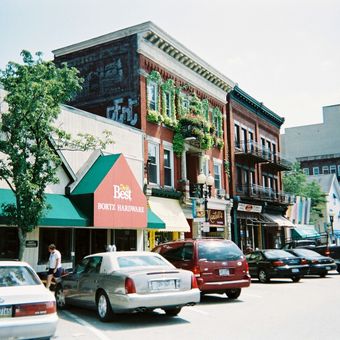 Le Temple Maçonnique, construit en 1872 au 132 South Main Street, reste la plus ancienne structure du district avec sa façade en fonte de style italien.