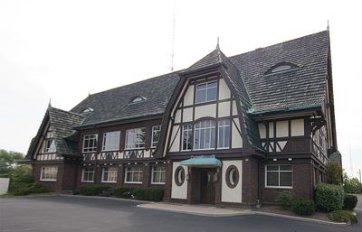 Le bâtiment Gruen Watch Company-Time Hill présente une architecture Tudor Revival avec des murs en briques, des colombages et un toit en tuiles.
