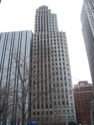 Le Koppers Building s'élève à 145 mètres sur 34 étages, avec des murs en calcaire d'Indiana, une base en granit poli et un toit en cuivre foncé.