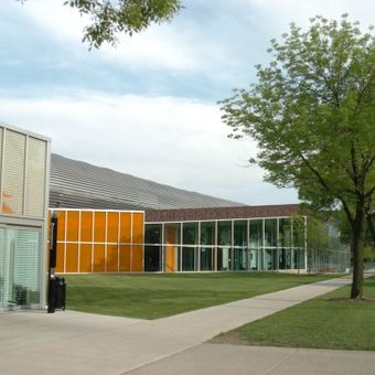 Le bâtiment affiche des symboles circulaires conçus par Michael Rock, notamment un grand portrait de l'architecte Mies van der Rohe sur les portes d'entrée ouest. Ces éléments marquent le caractère du lieu et en font un repère visuel sur le campus.