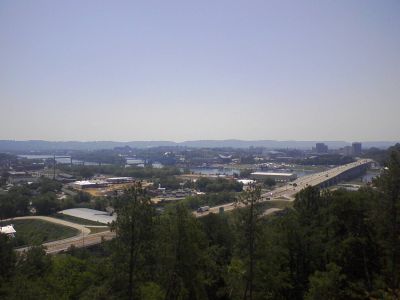 Le pont P. R. Olgiati s'étend sur 550 mètres au-dessus de la rivière Tennessee avec une section principale de 122 mètres au-dessus de l'eau.
