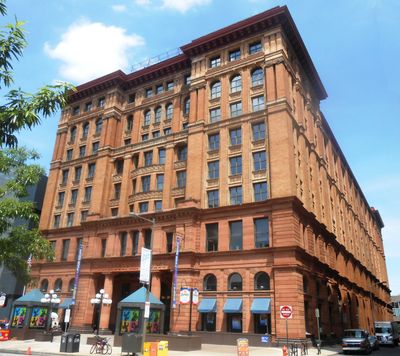 Le bâtiment Philadelphia Bourse de neuf étages présente une façade construite en grès rouge Carlisle, briques Pompéiennes et éléments décoratifs en terre cuite.