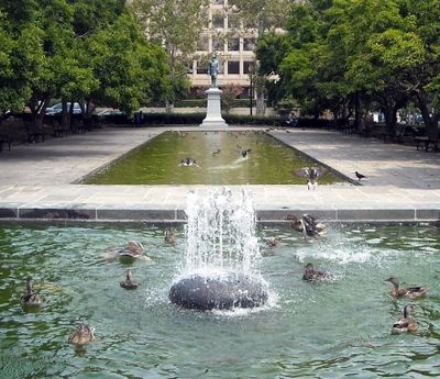 Rawlins Park est un espace vert urbain rectangulaire à Washington D.C. avec des fontaines en marbre, des bassins rectangulaires et des zones gazonnées à différents niveaux reliées par des escaliers. L'agencement crée des zones distinctes que les visiteurs découvrent en parcourant le parc.