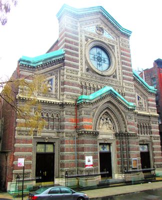 L'église en briques sur West 132nd Street présente des bandes de briques rouges, des briques émaillées céladon et de la terre cuite polychrome.