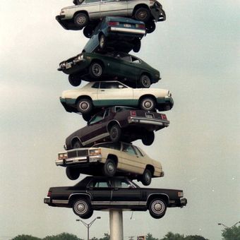 L'artiste Dustin Shuler a créé cette œuvre en 1989 en utilisant des véhicules des années 1960 à 1980, avec un Coccinelle Volkswagen rouge au sommet. La sculpture a tenu debout pendant 19 ans avant d'être démantelée en 2008 pour faire place à une nouvelle pharmacie.