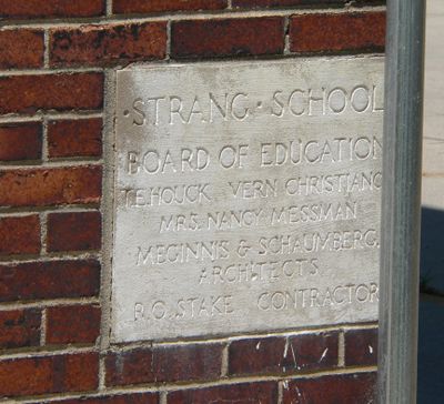 Le District Scolaire Strang No. 36 présente une structure en briques de deux étages avec de grandes fenêtres à six carreaux et un pavillon central.