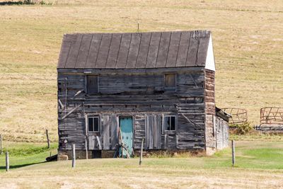 La maison présente des méthodes de construction traditionnelles avec ses rondins assemblés en queue d'aronde, visibles aux endroits où le bardage est abîmé.