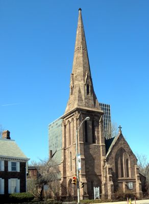 L'église épiscopale House of Prayer et son presbytère se dressent aux rues Broad et State, présentant une architecture néogothique en grès local et charpente en bois.