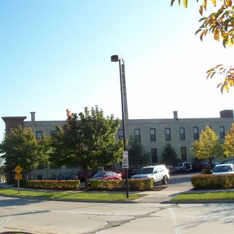 L'usine Jung Shoe Manufacturing Company est un bâtiment de style néoclassique situé à Sheboygan, Wisconsin, construit en 1906. Il se caractérise par des fenêtres symétriques, des murs en briques massifs et des détails décoratifs comme une corniche et des entrées cintrées typiques de l'architecture industrielle du début du vingtième siècle.