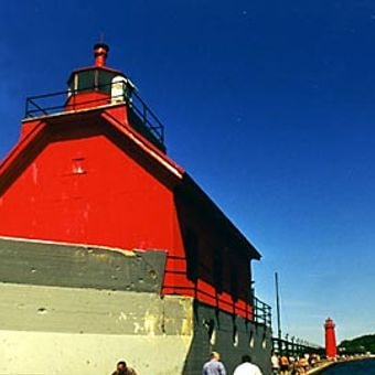 Le phare d'entrée sud de Grand Haven comprend deux feux rouges reliés par une passerelle menant à la promenade maritime.
