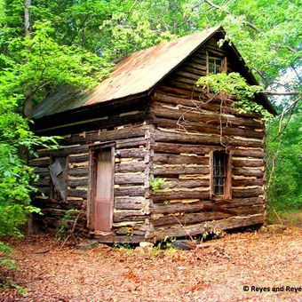 La cabane présente des rondins à entailles en V, un toit à pignon, une pièce principale avec un grenier et une cheminée en briques et pierres.