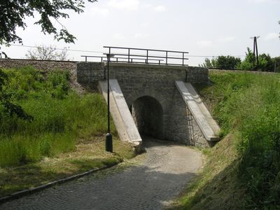 Železniční most přes místní komunikaci v Chrástu nad Sázavou, úzký kamenný jednoobloukový most přes cestu v údolí bezejmenného potoka v centru Chrástu nad Sázavou