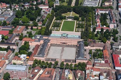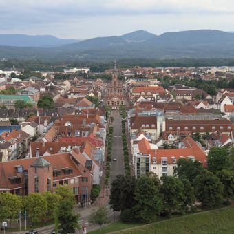La ville se trouve dans le nord du Bade-Wurtemberg à la lisière ouest de la Forêt-Noire et s'étend entre le Rhin et de douces collines. Au centre se dressent des bâtiments à plusieurs étages aux façades de plâtre clair et aux fenêtres disposées symétriquement autour d'un complexe palatial central, tandis que quartiers résidentiels et zones industrielles façonnent le paysage extérieur.