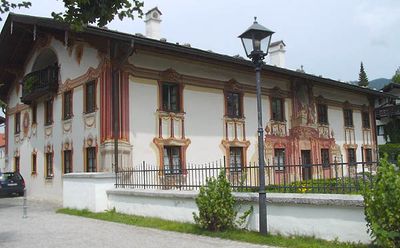 Située à 837 mètres d'altitude, Oberammergau présente des bâtiments décorés de fresques le long des rues bordées par les Alpes bavaroises.