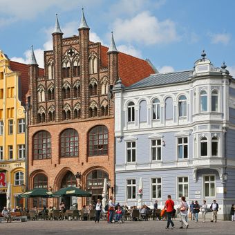 L'Alter Markt est une place rectangulaire au cœur de Stralsund, dans le nord de l'Allemagne, bordée par certains des bâtiments en brique les plus remarquables de la ville. L'hôtel de ville et l'église Saint-Nicolas forment le côté le plus reconnaissable de la place, l'un à côté de l'autre.