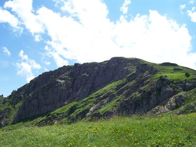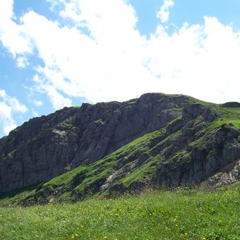 Le Stuiben s'élève à 1 749 mètres, présentant des dalles de conglomérat escarpées près du sommet et des pentes douces de prairie sur son versant sud.