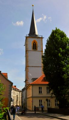 La Nikolaikirche présente une haute tour avec son clocher et un toit de tuiles rouges, caractérisée par des éléments architecturaux gothiques tardifs.