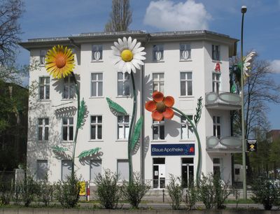 L'édifice abrite l'installation artistique 'Riesenblumen' créée par Sergej Alexander Dott, associant services médicaux et expression artistique dans l'espace urbain.