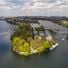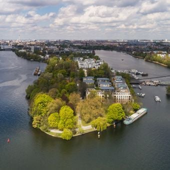 La péninsule s'étend entre la rivière Spree et le lac Rummelsburg dans l'est de Berlin, formant une masse terrestre avec des chemins le long du front d'eau.