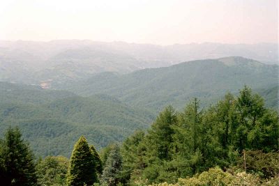 Un chalet moderniste se dresse au sommet du mont Aizkolegi, accessible par piste forestière et offrant des vues sur le parc.