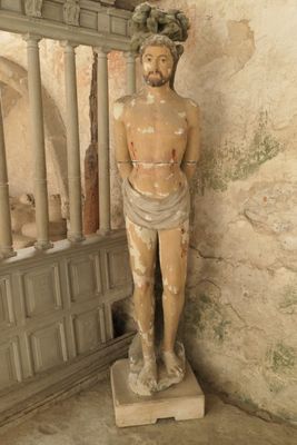 Saint Sébastien, statue du XVIe siècle en terre cuite peinte sise dans la chapelle Notre-Dame à Pritz, lieu-dit à Laval (Mayenne, Pays de la Loire, France) ; inscrite en tant qu'Objet monument historique (PM 53000742) ; fiche Palissy erronée concernant le sujet