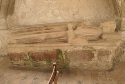 Gisant de l'épouse d'André de Mérienne, statue du XIVe siècle en pierre taillée représentant le gisant de l'épouse du seigneur de Mérienne, sise dans la chapelle Notre-Dame à Pritz près de Laval (Mayenne, Pays de la Loire, France) ; classée en tant qu'Objet monument historique (PM53000339)