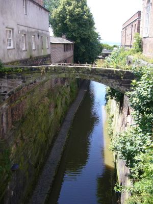 La passerelle en grès rouge traverse le Canal de Chester avec un arc segmentaire et présente des voussoirs affleurants peu profonds.