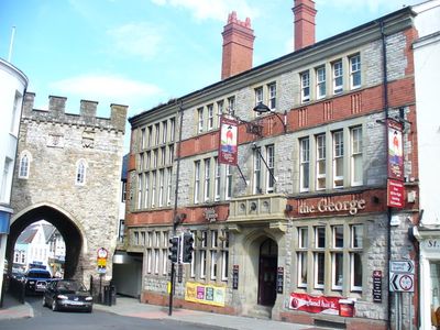 Le George Hotel présente des éléments architecturaux traditionnels avec des détails d'époque préservés, situé près de la porte médiévale de Chepstow.