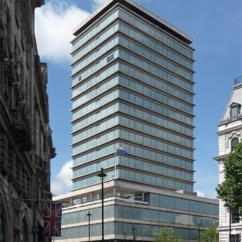 La Maison de la Nouvelle-Zélande s'élève sur 18 étages depuis un podium de quatre niveaux à l'intersection de Haymarket et Pall Mall.