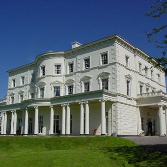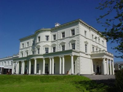 Le bâtiment géorgien tardif se dresse sur de vastes terres au nord de Portsmouth, avec des éléments architecturaux classiques et des proportions symétriques.
