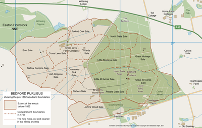 Bedford Purlieus est une réserve naturelle près de Stamford s'étendant sur plus de 200 hectares de forêt ancienne avec des types de sol variés accueillant une grande variété de plantes et d'animaux. Les différentes conditions du terrain créent des habitats distincts où plusieurs espèces cohabitent dans un écosystème connecté.