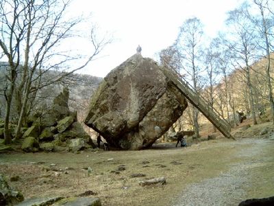 La Bowder Stone est une formation rocheuse massive faite de matière de lave durcie positionnée à Borrowdale, servant de repère frappant dans la vallée. La pierre se trouve dans un espace confiné et est rendue accessible par des sentiers de marche permettant aux visiteurs d'atteindre sa base et son sommet.