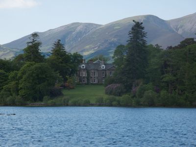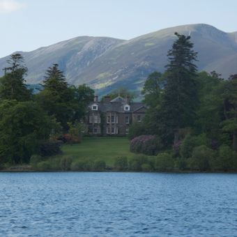 Le manoir de style classique s'élève sur une île boisée de trois hectares dans le Derwent Water, avec des ailes est et ouest.