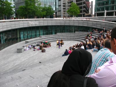 The Scoop est un amphitheatre en plein air sur la rive sud de la Tamise avec des sieges disposes en gradins pour environ 1000 spectateurs. La conception enfoncee cree une structure de stade naturelle avec une bonne visibilite pour tous les spectacles.