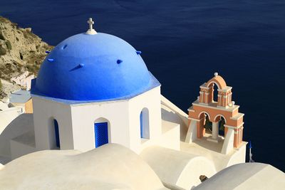 Cette église présente des murs blancs éclatants contrastant avec un dôme bleu rond, se détachant sur le fond de la mer Égée.