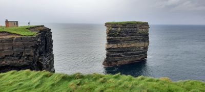 Dun Briste est un rocher calcaire qui s'élève à 45 mètres au-dessus de la mer et se dresse à environ 80 mètres des falaises continentales de Downpatrick Head. Cette colonne spectaculaire peut être observée depuis plusieurs points de vue aménagés le long de la pointe rocheuse.