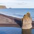 La plage contient des colonnes hexagonales naturelles de basalte formées par le refroidissement rapide de la lave, créant des motifs géométriques.