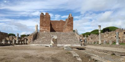 Le Capitolium à Ostia Antica est un temple romain qui s'élève à l'extrémité nord du Forum avec une hauteur d'environ 17 mètres. La structure comprend un escalier de 21 marches, les fondations du vestibule et des pièces souterraines dotées de voûtes en berceau sous le sol principal du temple.