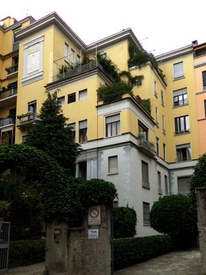 Casa della Meridiana est un immeuble d'habitation a Milan comportant cinq etages avec des terrasses decroissantes et de vastes fenetres ouvrant sur un jardin prive a Via Marchiondi 3. Chaque etage contient un seul appartement accessible par ascenseur, remplacant l'escalier d'honneur traditionnel par le confort moderne.