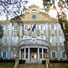 La villa de trois étages présente un portique semi-circulaire, des frises classiques et des éléments architecturaux symétriques sur sa façade en pierre.