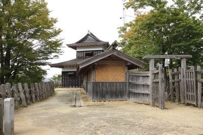 Le château reconstruit présente des tours de guet en bois, des corps de garde et des murs défensifs illustrant l'architecture militaire japonaise médiévale.