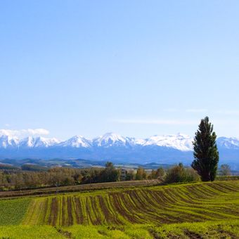 Le Ken and Mary Tree est un peuplier au milieu des champs de blé de Biei au Japon, s'élevant à environ 30 mètres au-dessus du paysage plat. Le tronc se dresse seul sur une douce pente et contraste fortement avec le ciel, tandis que les champs environnants s'étendent en parcelles régulières vers l'horizon.