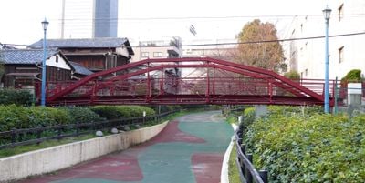 Le Pont Hachiman traverse un cours d'eau reliant les quartiers de Tomioka à Kōtō-ku en utilisant une structure en treillis d'acier avec des détails architecturaux caractéristiques. Il sert de connexion piétonne à travers des zones résidentielles tranquilles menant vers le sanctuaire local.