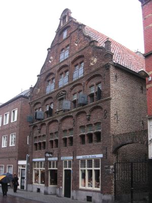La maison Huize Schreurs, construite en briques, présente une façade Renaissance avec deux bustes sculptés dans des cadres ronds et des pierres masques diamantées.