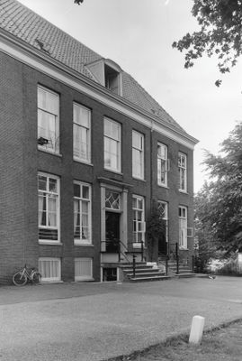 Huis met sobere lijstgevel en stoep, geen versiering boven de deur, tegenhanger van nr 6