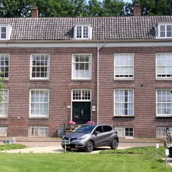Pand met lange gevel met rechts en links vleugels, gebeeldhouwde middenpartij, mansardedak
