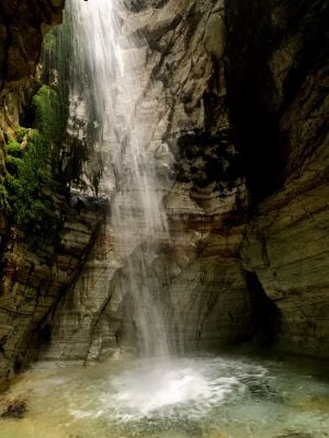 Dans la section intermédiaire, le chemin se courbe en S à travers la roche avant de s'ouvrir sur un bassin naturel en marbre à la base de la cascade. Ce bassin s'est formé au fil des millénaires et crée un bassin blanc frappant entouré de parois de pierre noire.