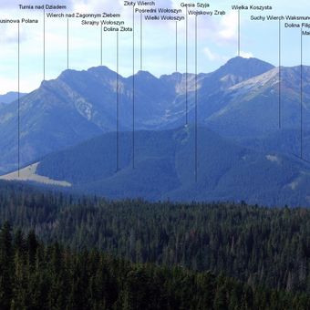 Gęsia Szyja est un sommet montagneux des Hautes Tatras atteignant 1.489 mètres avec des formations rocheuses en dolomite courbes au sommet. Les structures calcaires incurvées créent la forme singulière qui caractérise l'apparence de la montagne.